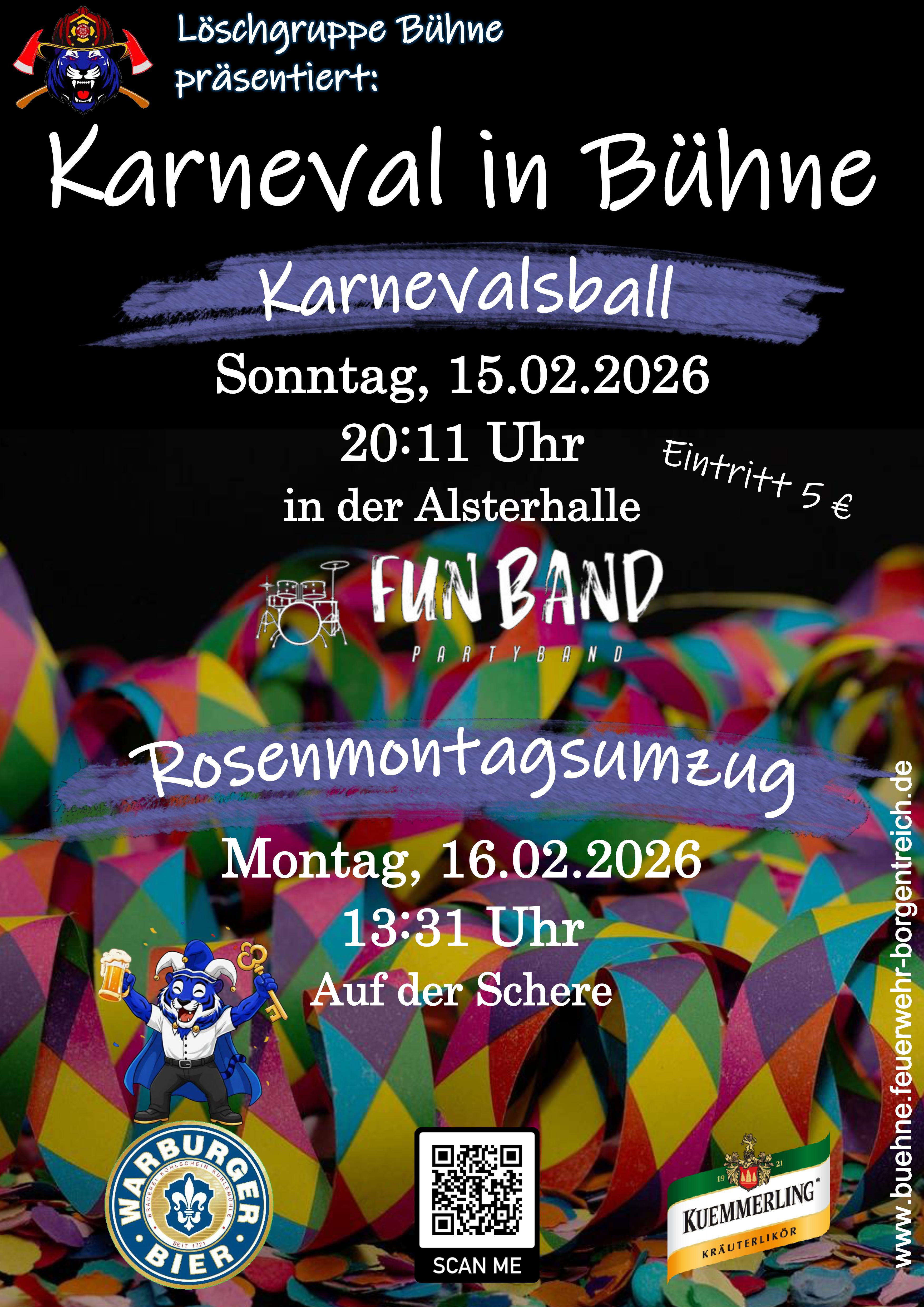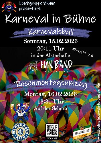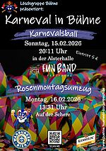 Der diesjährige Karnevalsball findet am 15.02.2026 ab 20:11 Uhr in der Alsterhalle Bühne statt. Musikalisch wird die Fun Band - Partyband für Stimmung sorgen. Der Eintritt beträgt 5 €.